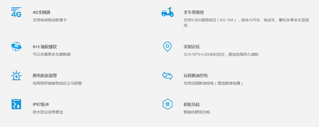 产品概述:KG-10/KG-10A是一款4G全网通、9-90V 宽压适用于电摩汽全车型的有线4G定位终端,6+3轴陀螺仪,支持碰撞报警、震动报警、侧翻报警、急加速、急减速和急转弯报警,智能休眠低功耗