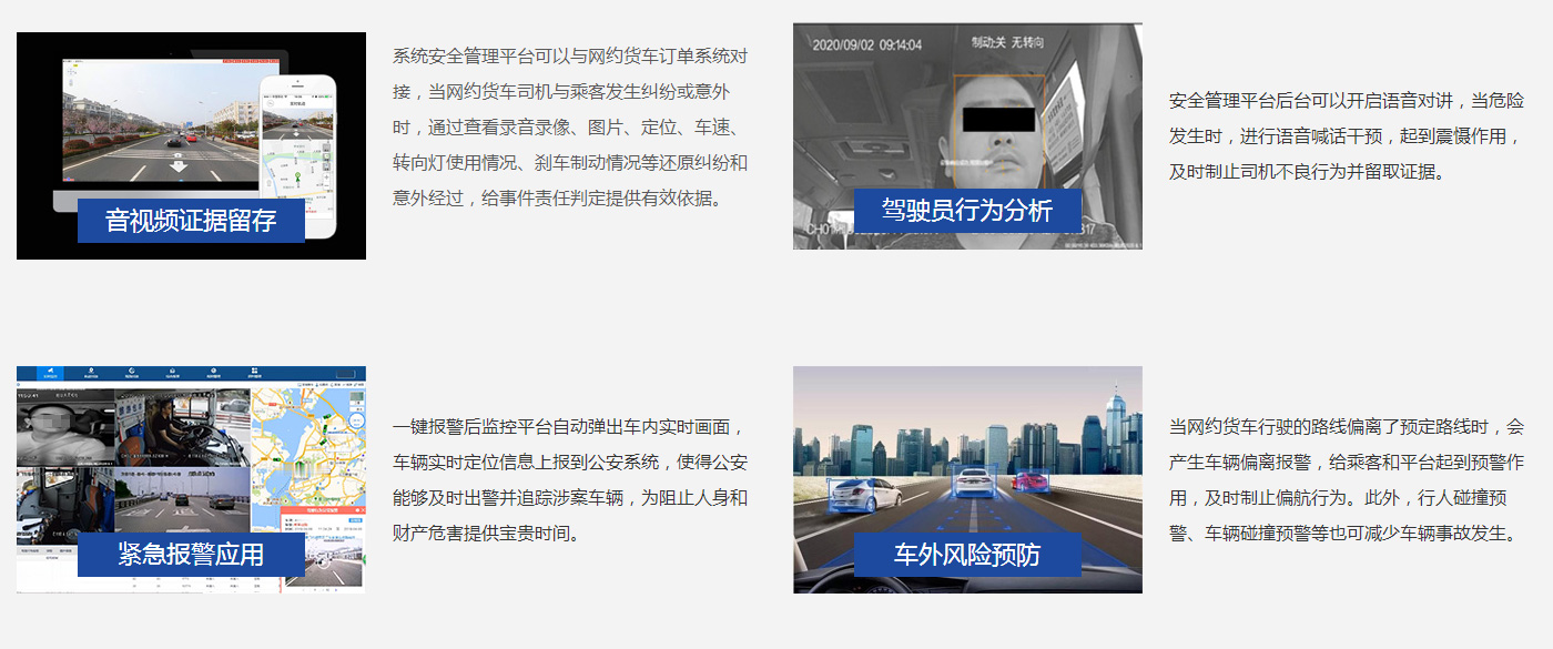 结合重型货车和网约货车市场行业运营管理现状,量身打造了完善的解决方案,配备智能车载设备和安全管理平台,其中安全管理平台可以与企业业务平台进行对接,帮助解决行业痛点,为企业及个人打造专属安全平台。