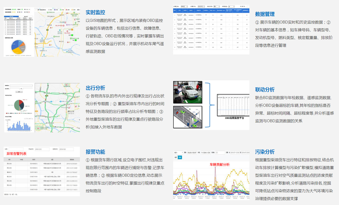 ◆重型柴油车OBD远程监控管理平台:提供实时监控、数据管理、报警管理、岀行分析、污染分析、关联分析、等功能,掌握重型柴油货车岀行规律,监控车辆的运行状态,分析尾气排放特征及与运行状态的关系,评估桨油车尾气排放对国控站点的影响程度。