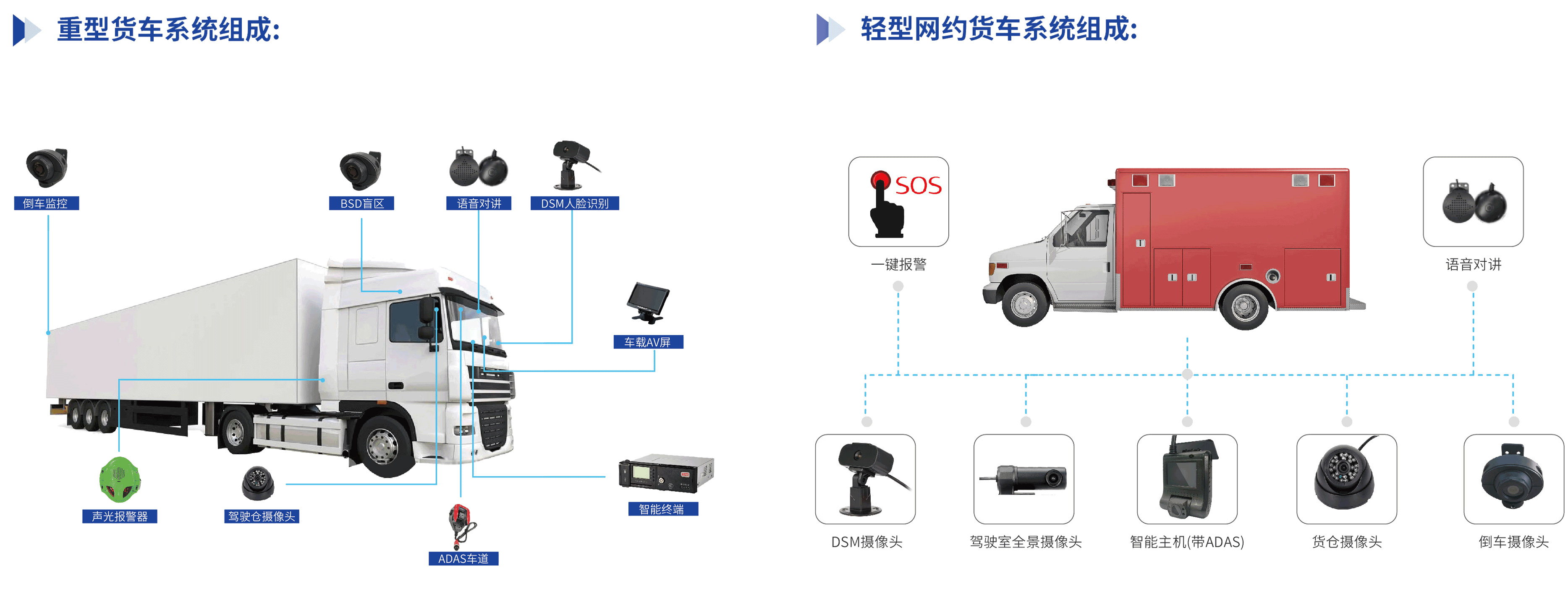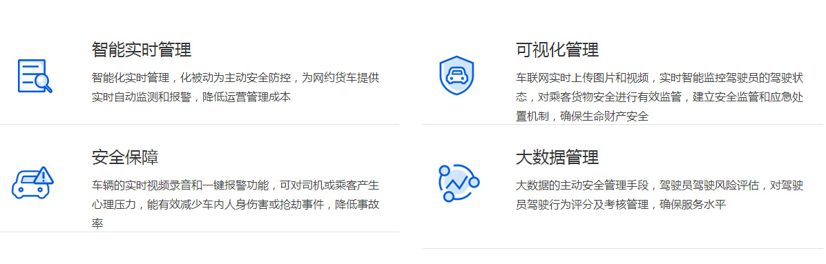 结合重型货车和网约货车市场行业运营管理现状,量身打造了完善的解决方案,配备智能车载设备和安全管理平台,其中安全管理平台可以与企业业务平台进行对接,帮助解决行业痛点,为企业及个人打造专属安全平台。